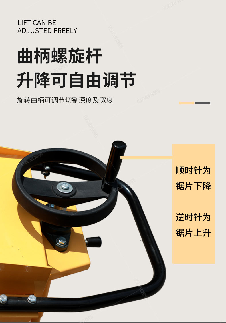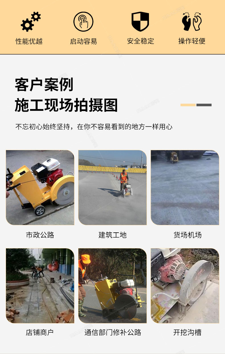 用于公路、市政、建筑、煤氣、通信部門修補公路或開挖溝槽時進行路面切割。相對于電動或柴油動力的路面切割機,操作輕巧省力,運輸方便,工作效率高。