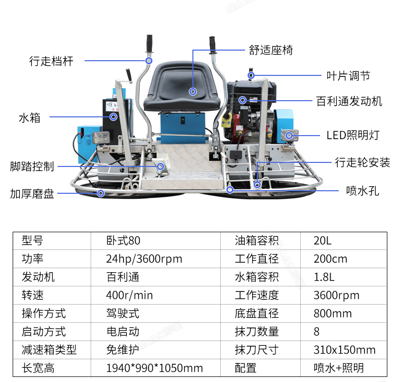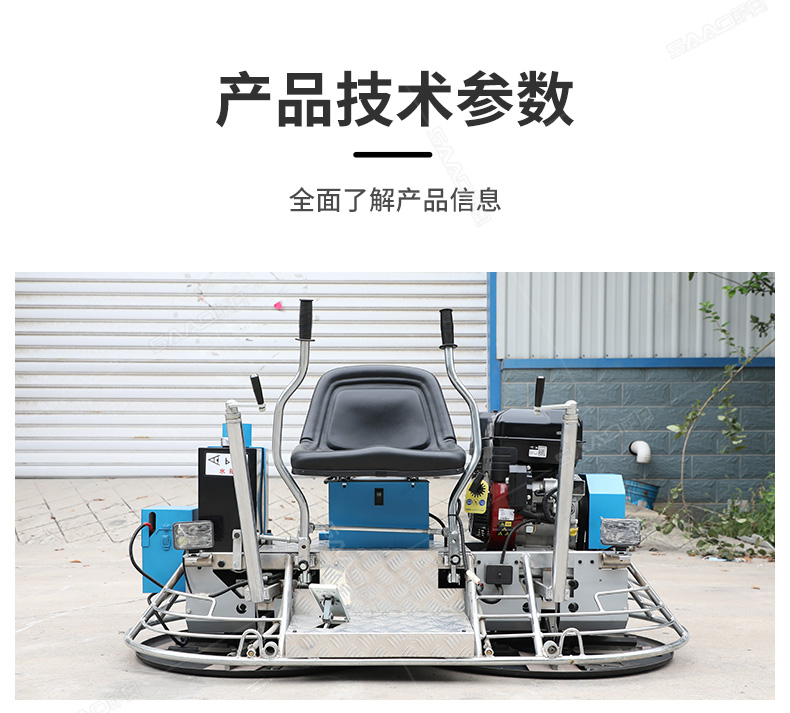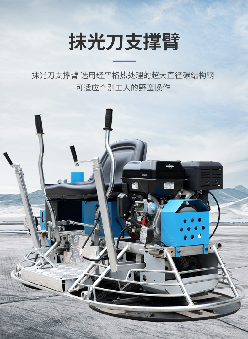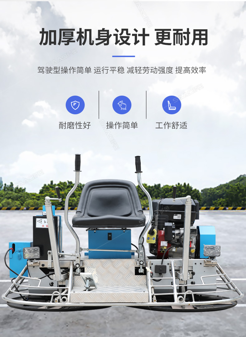 【產(chǎn)品介紹】 座駕式抹光機(jī)用于混凝土地面的提漿、壓實(shí)、抹平、抹光,座駕式操作大大降低了操作者勞動(dòng)強(qiáng)度,提高了作業(yè)效率。 【產(chǎn)品優(yōu)勢(shì)】 1、一機(jī)搞定省時(shí)省錢,適用范圍廣泛
