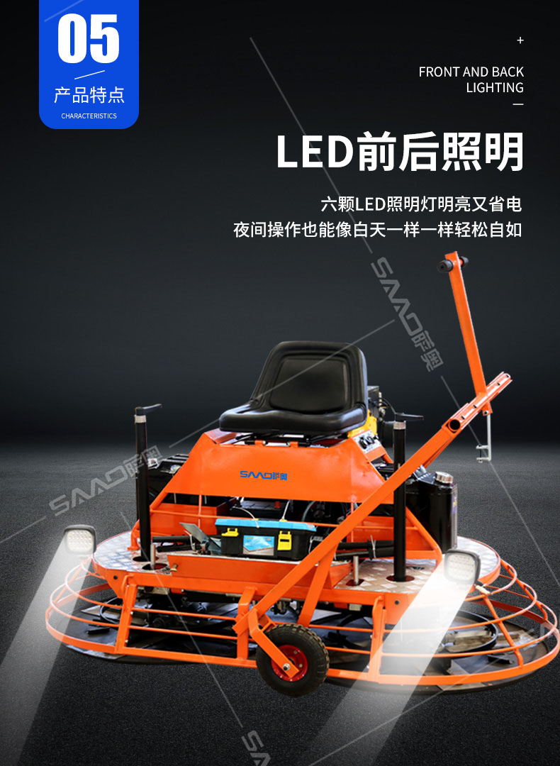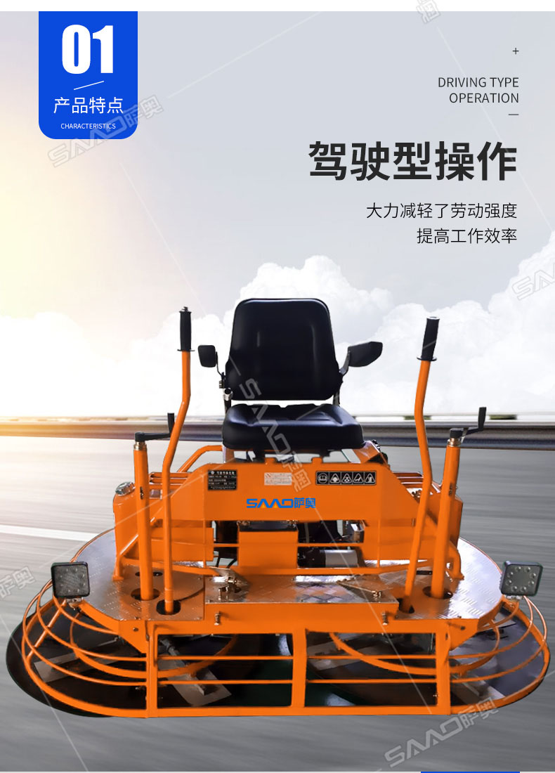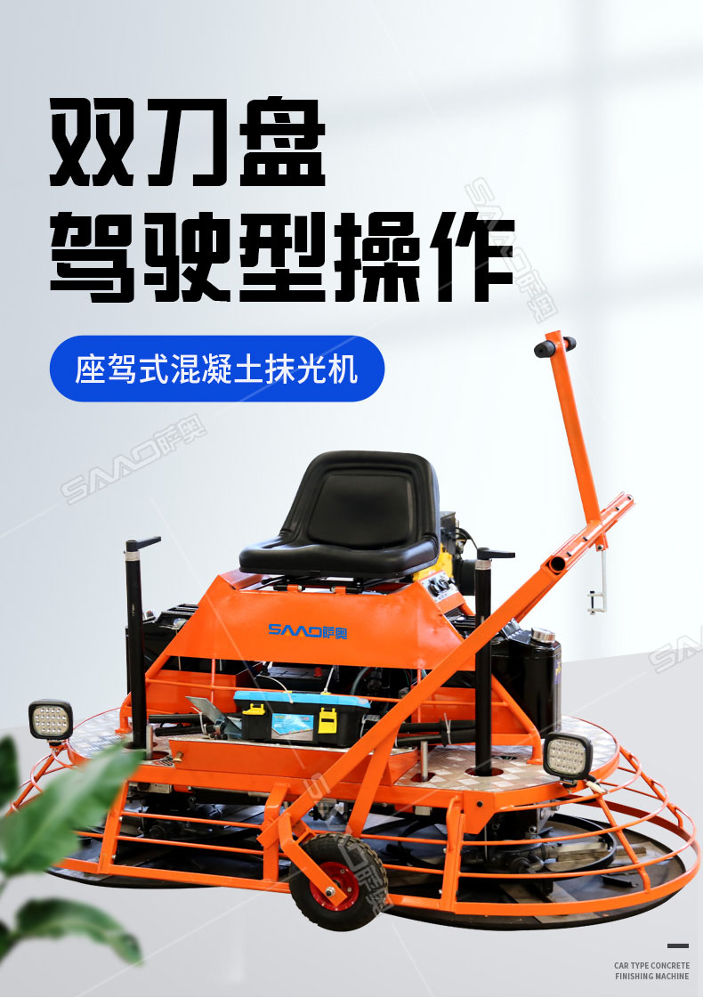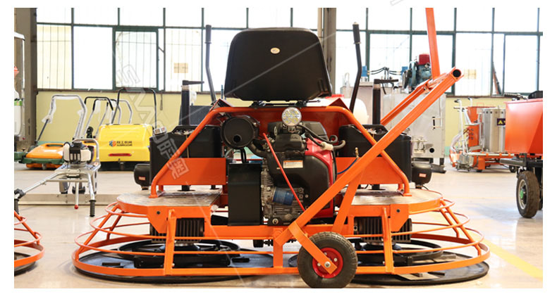 座駕式混凝土抹光機用于混凝土地面的提漿、壓實、抹平、抹光。相對于手扶式抹光機,效率極高。