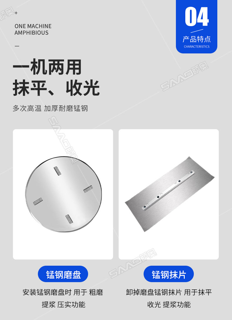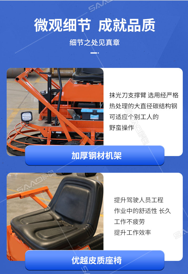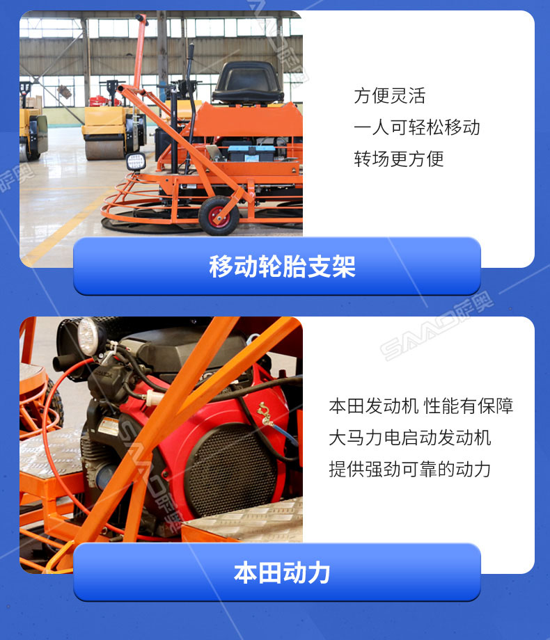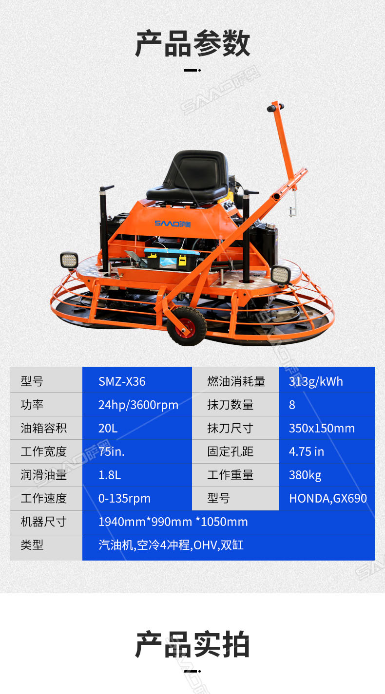 概述:用于混凝土地面的提漿、壓實、抹平、抹光。相對于手扶式抹光機,效率極高。