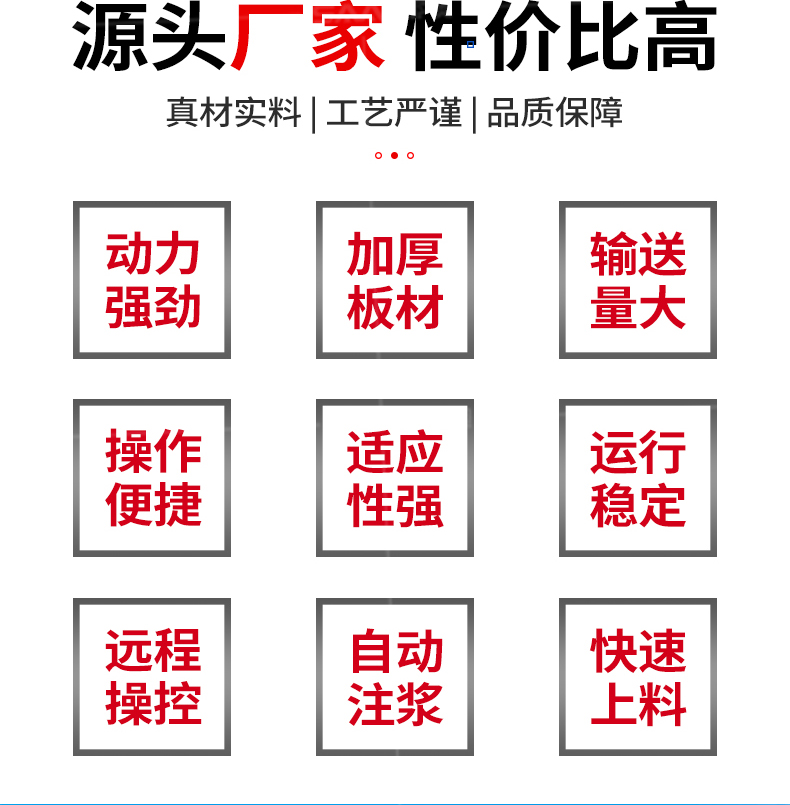 | 1 | 操作方式 | 遙控或手動 | 料斗帶攪拌功能、可輸送機制砂料、大顆粒石子、高標號料 |