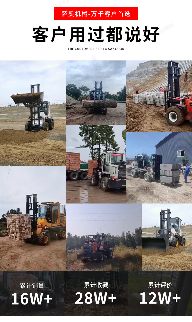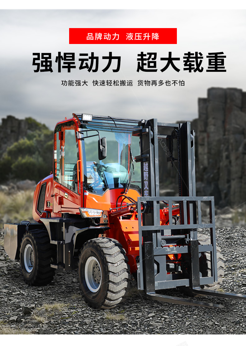 3.普通叉車只能在平整的路面上作業,而越野叉車既可以在普通路面上作業,還可以在山路泥路崎嶇道路作業,輪胎抓地力強,不打滑。
