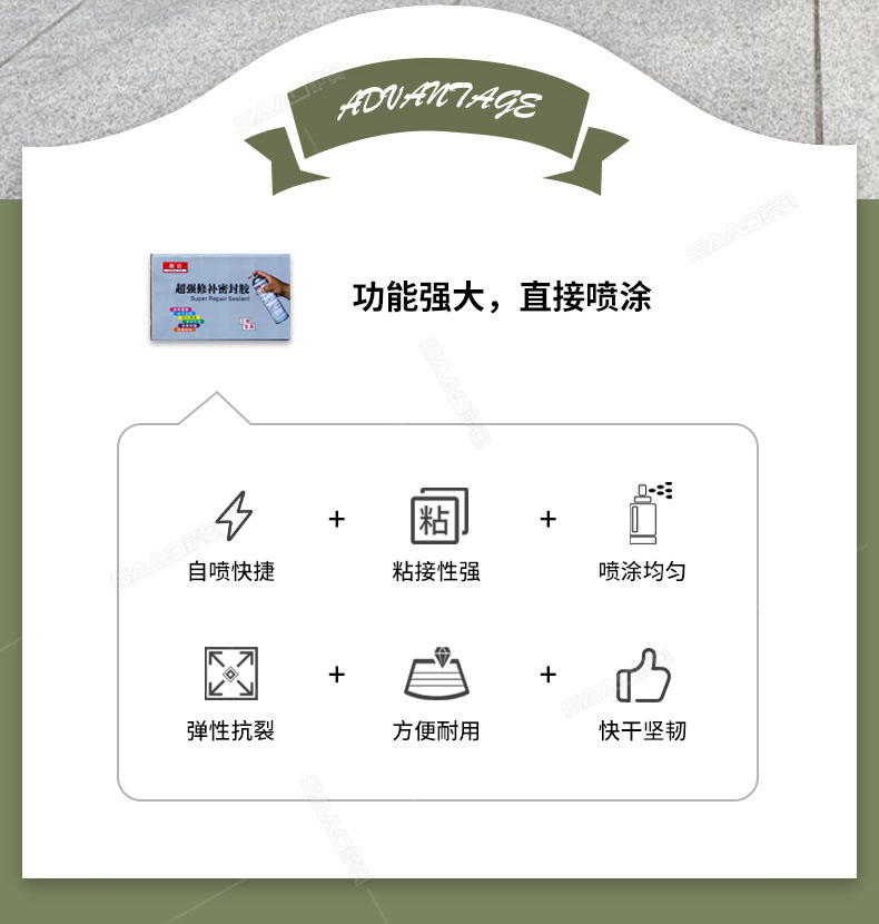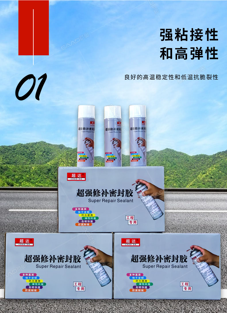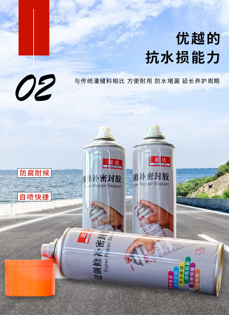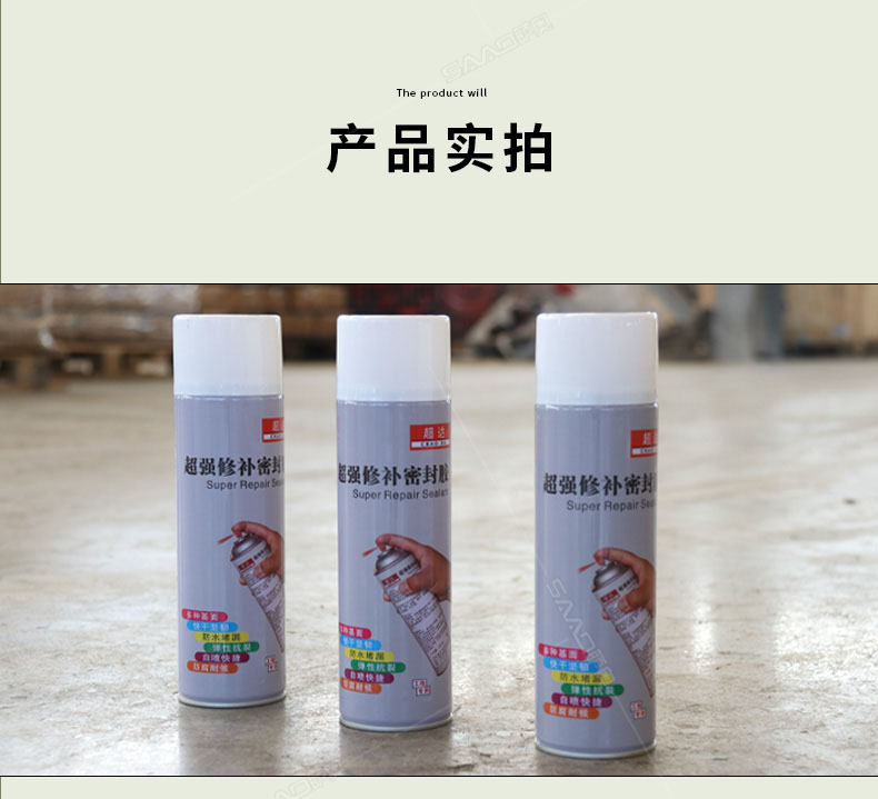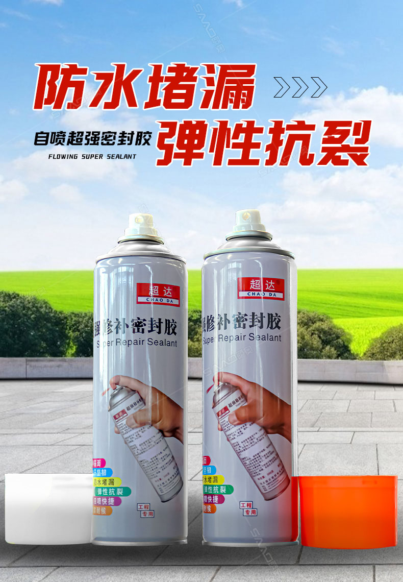 產品特性: 超強修補密封膠是專為防水施工中管根、管口、拐角和裂縫等處防水修復、薄弱易漏點而開發。直接噴涂、噴涂后形成強效橡膠密封保護膜,有效附著于各類表面與材質,直