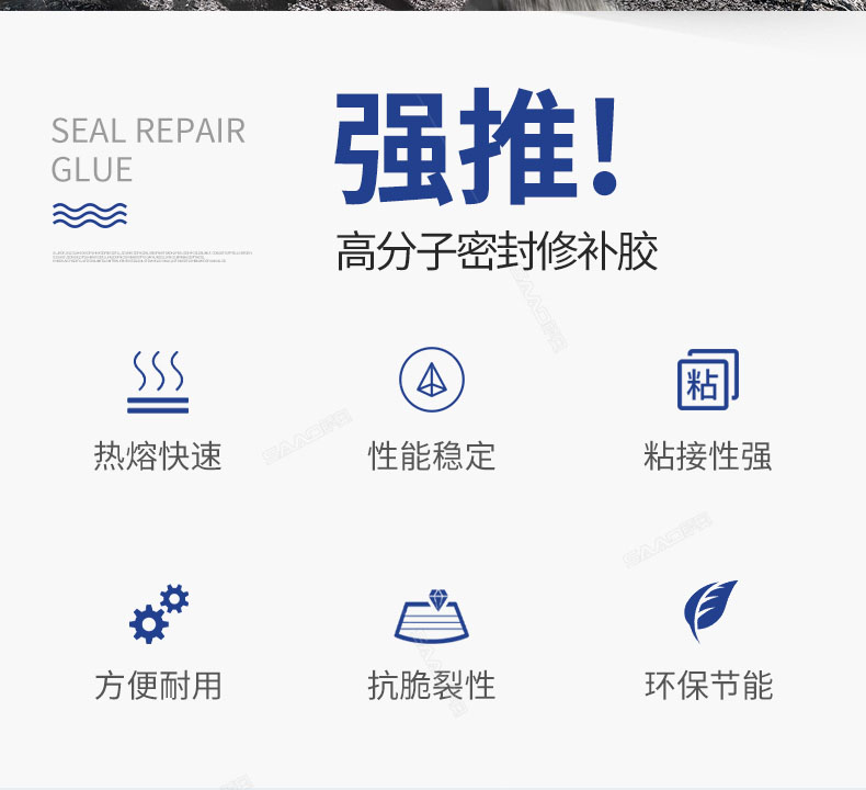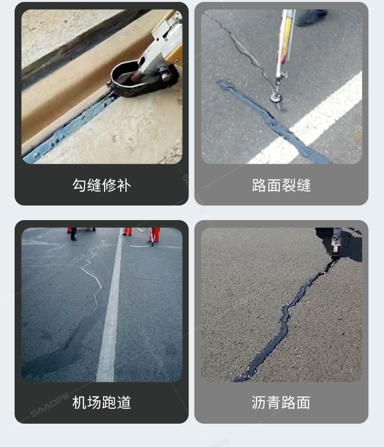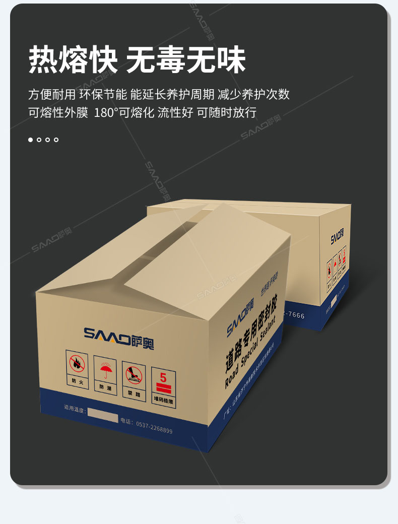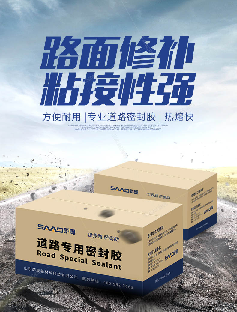 薩奧系列密封膠為固態改性瀝青和熱塑橡膠的復合材料,熱熔快,粘接性強,具有良好的抗形變恢復性能。與其它類型密封膠相比,該類型具有低稠度,易于滲入各種裂縫等特點。在夏季,其高溫軟化點可達96℃;在冬季,其耐低溫可達近似-23℃,因此更適合在溫差跨度大的溫帶環境。