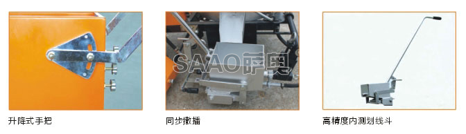 SAAO-320自走式熱熔劃線機(jī)采用德國最新的智能程序控制器和人性化控制面板,并配加進(jìn)退自如的無級(jí)變速行走系統(tǒng),大大提高了施工效率,是熱熔標(biāo)線施工的關(guān)鍵設(shè)備,同熱熔釜配合使用,完成標(biāo)線施工,該機(jī)采用特殊制造的高精密度鑄鐵劃線斗,確保所劃標(biāo)線邊齊,頭齊,厚薄均勻,線型美觀,落地刀能夠適應(yīng)不同情況的路面.