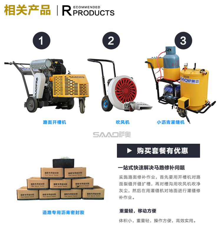 開槽機主要用于瀝青、水泥路面裂縫病害處治時的開槽作業。通過特制金剛石刀片快速將不規則裂縫整理成均勻的凹槽,形成新的結合面。優化灌縫材料與縫槽的接觸層面,加強灌縫材料與縫槽側壁粘結的緊密性。