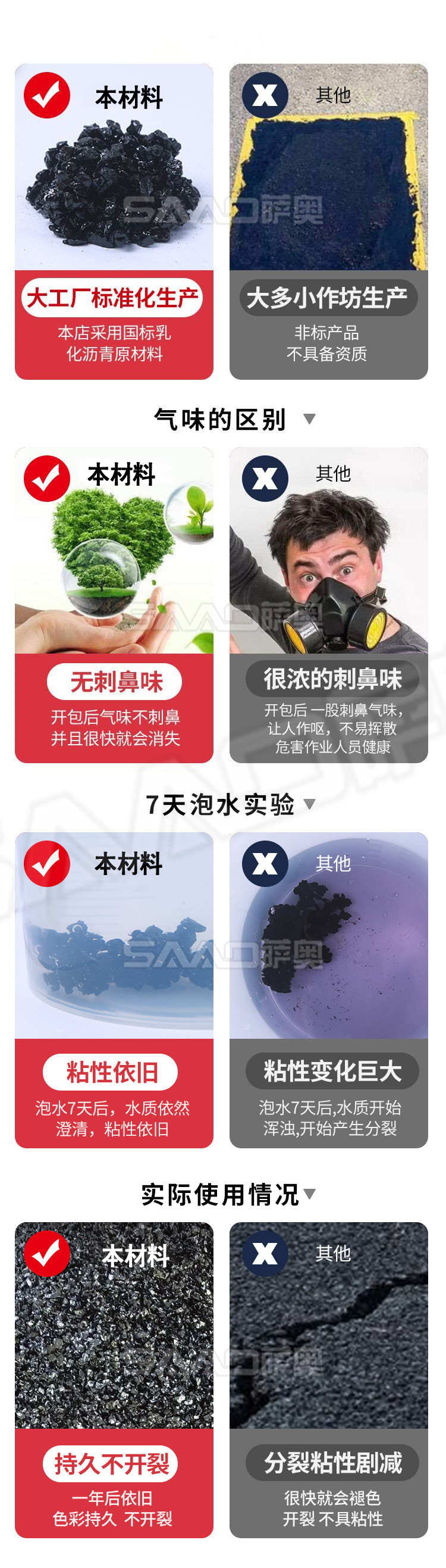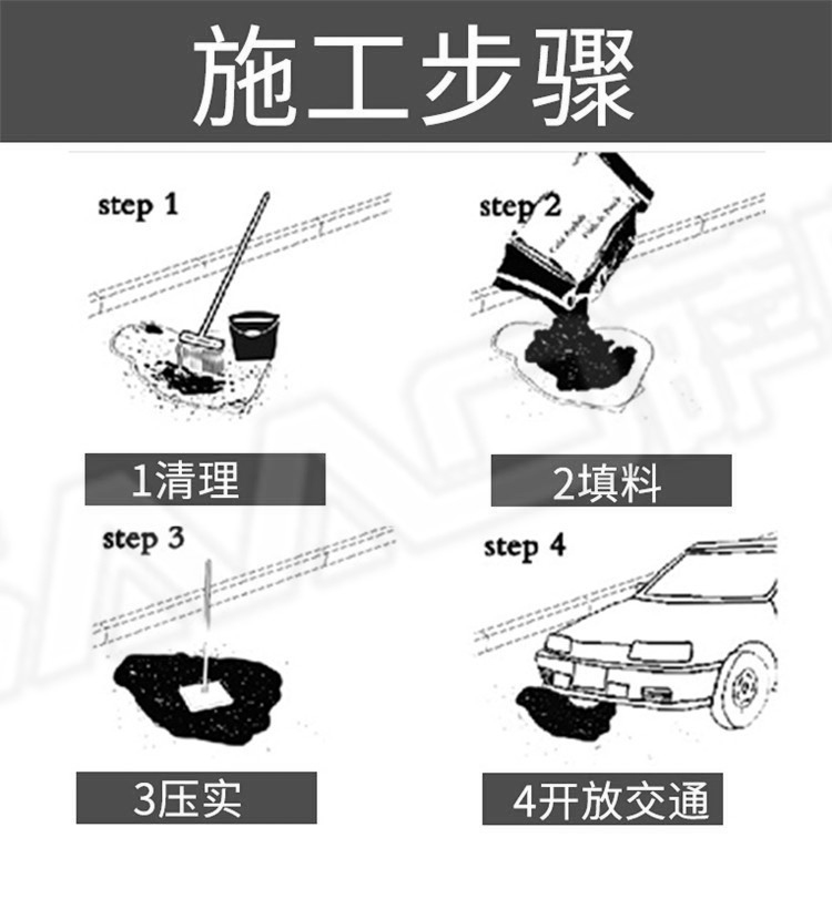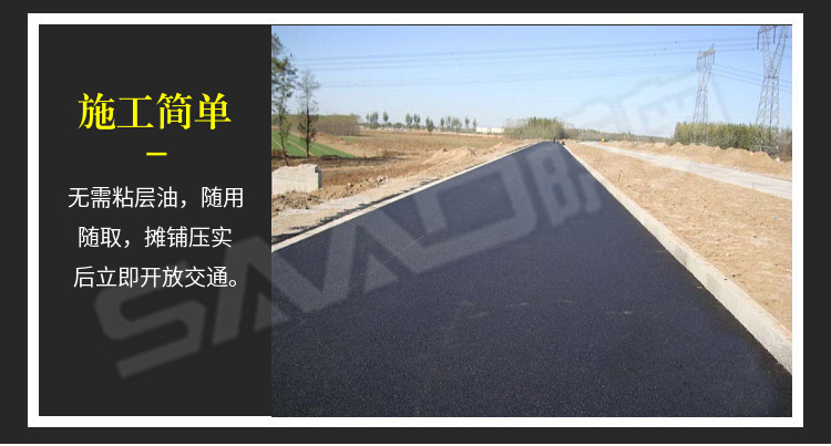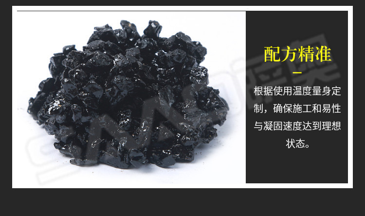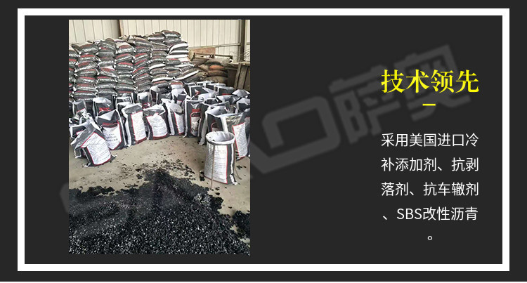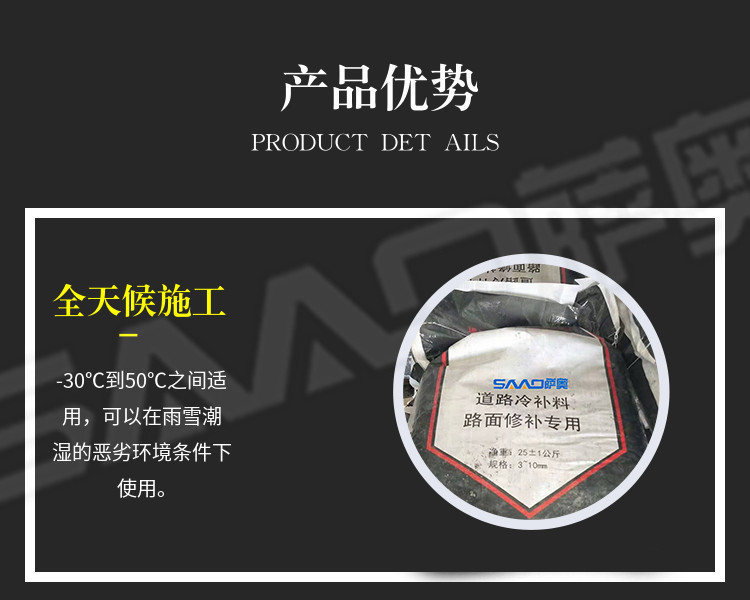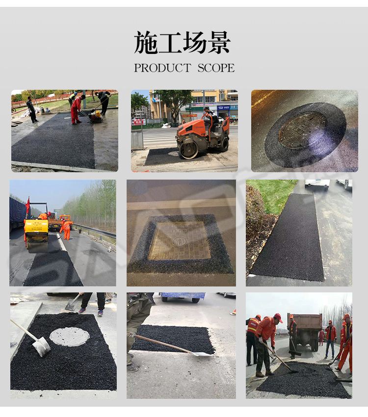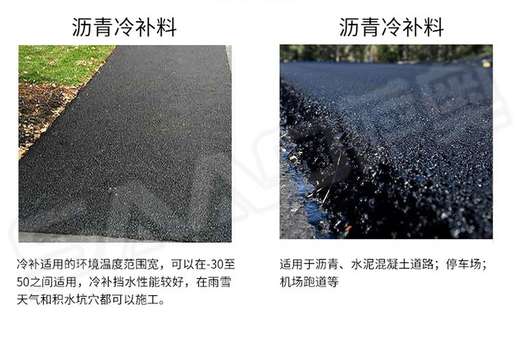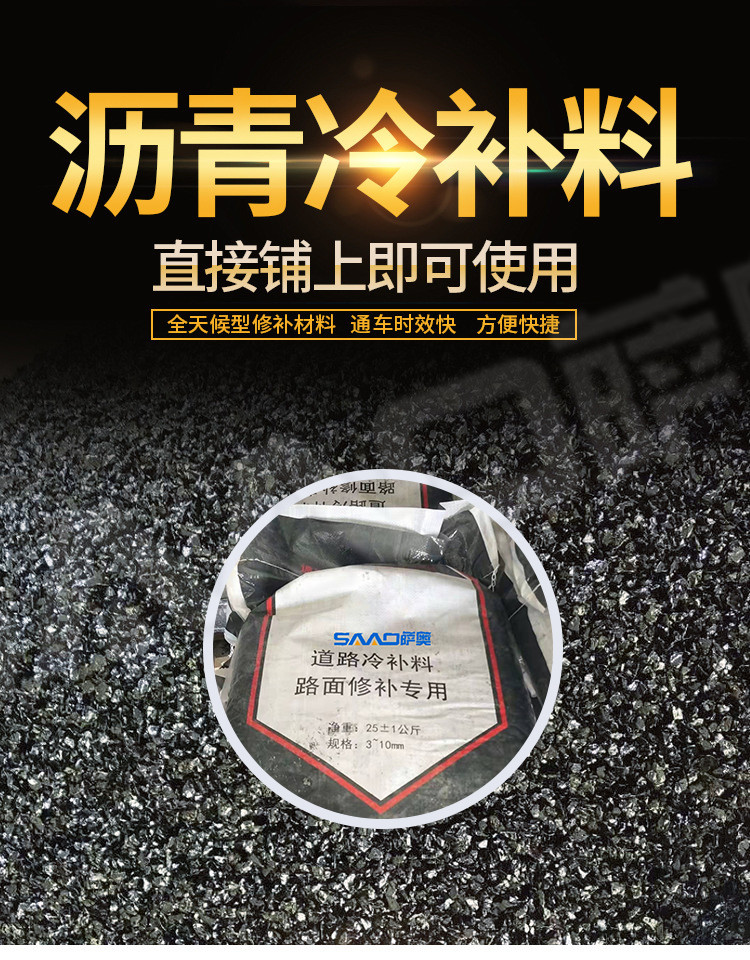 冷補料是采用特殊的方法改質瀝青,使得瀝青具的粘結性,感壓性和粘彈性,在適當壓實之后,能夠長久的粘在修補處不脫落。冷補料以其可以在全天候條件下修補路面,操作簡便,修補質量好,存放長久,節省費用等諸多優點,已被廣泛的應用于各省市道路路面修補且日益受到道路養護部門的認可和歡迎。冷補適用的環境溫度范圍寬,可以在-30至50之間適用,在雨雪天氣和積水坑穴都可以施工。