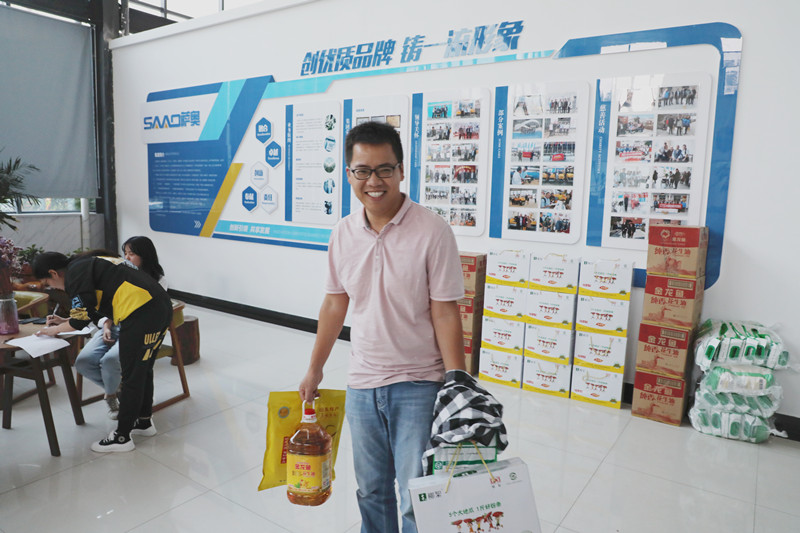 為了表達公司對全體職工的關愛之情,感謝大家的辛勤付出,9月28日下午,薩奧機械為全體職工發放了中秋節福利,將精心挑選的一箱箱禮包送到每一位員工的手中,同時也送去了公司對廣大職工的濃濃關愛和深深祝福。
