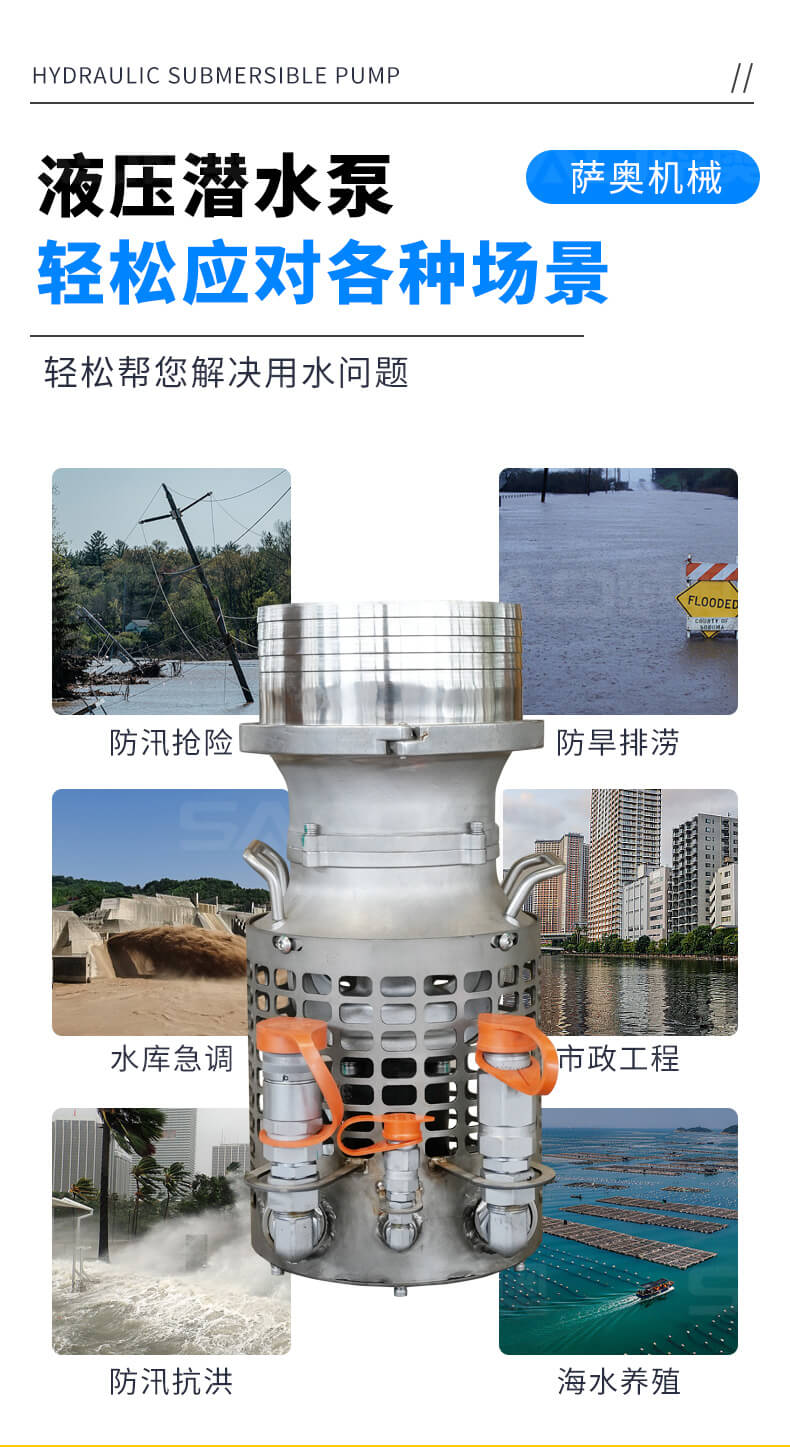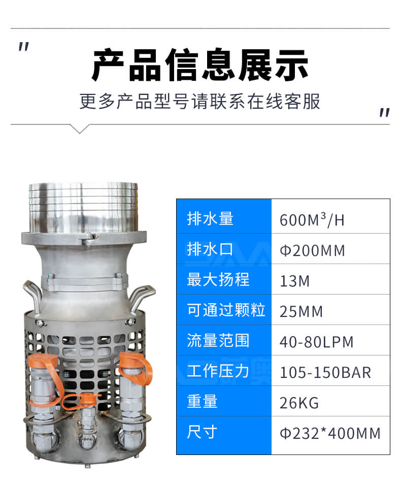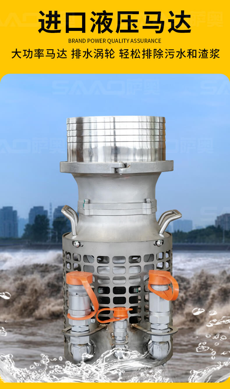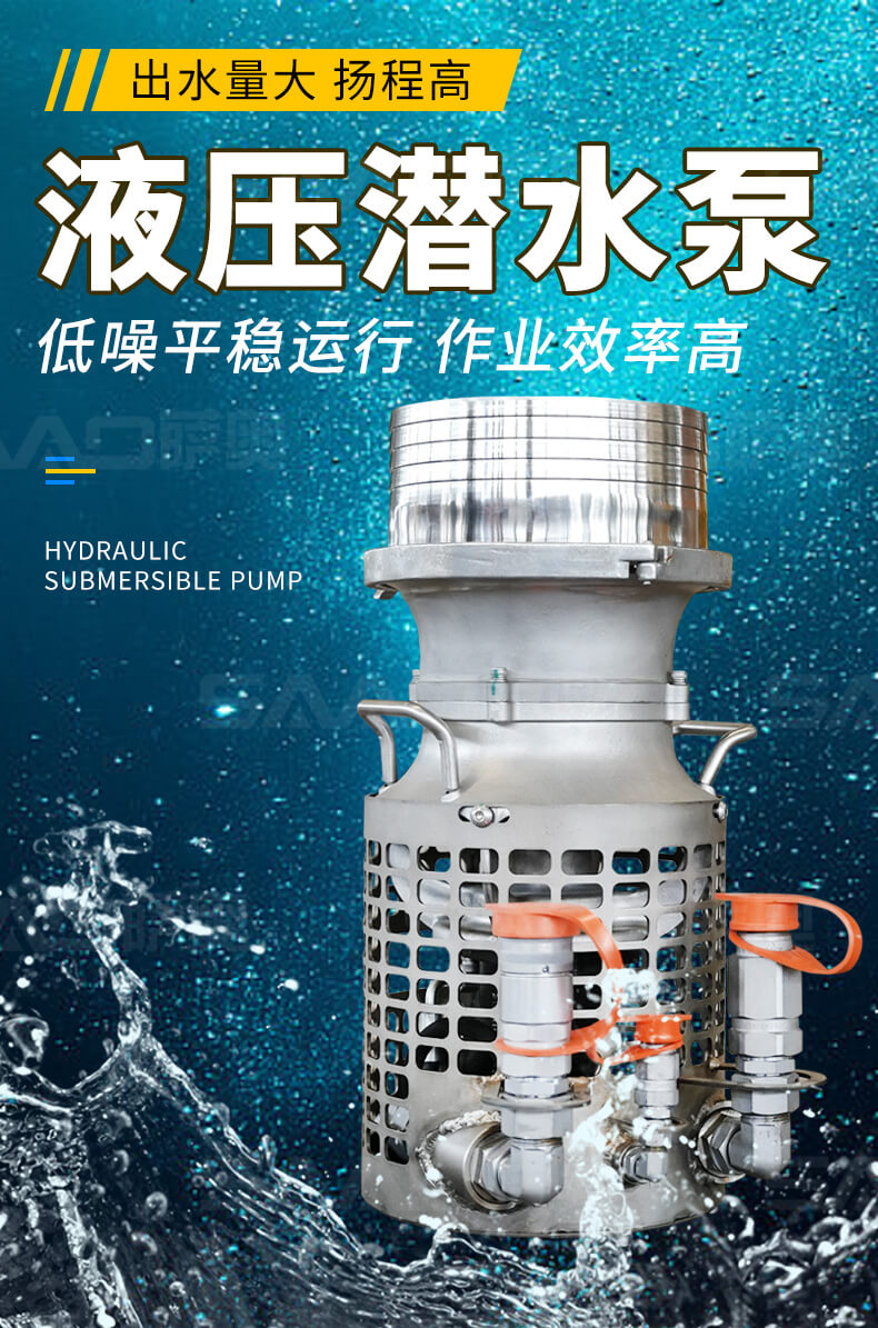 液壓潛水泵重量輕,適用苛刻環境,耐磨件少,幾乎不用維護保養,無需復雜操作培訓,可與挖掘機、裝載機等液壓動力源連接使用。